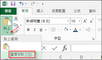 4. 選取[常用/剪貼簿/貼上]選單中的「選擇性貼上」。