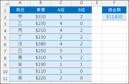 儲存格F2:=SUMPRODUCT(單價*(A組+B組))