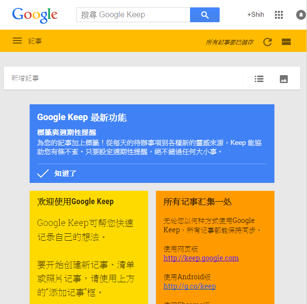平常我雖然大多數的記事工具都是使用 Evernote,而把 Google Keep 拿來做為記錄小事、雜事和做為提醒工具之用。今天看到手機上的 Google Keep App 又更新了,發現其新增的功能有為記事加上標籤和設定週期性提醒,這兩個都是實用的好功能。