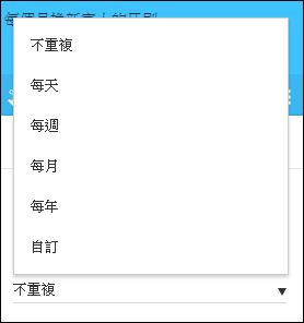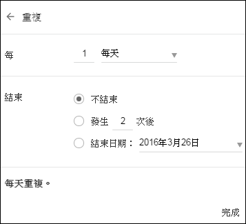 你可以指定重覆的週期為:每天/每週/每月/每年/自訂。自訂中可以設定結束的時間點。