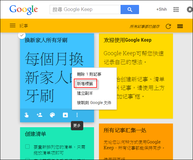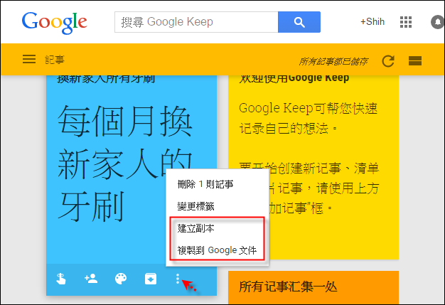 順帶一提,在 Google Keep 的記事中點選選單,你可以為這個記事建一個副本記事,也可以將記事內容複製到 Google 文件中,讓你可以在 Google 文件中繼續編輯。