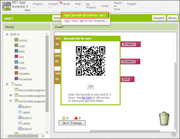 如果你想要將設計好的 App 下載到手機中執行,則可以在網頁上選取「Build/App(Provide QR Code for .apk」。只要用手機掃描這個 QR Code,即可下載這個 APK 檔,安裝後即可在手機上安裝及執行這個程式。
