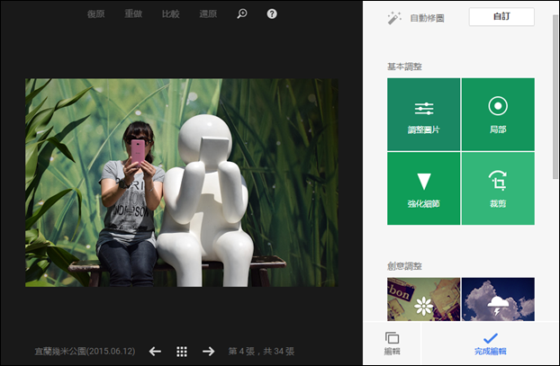 順便比較一下新舊相片編輯功能,在新的 Google 相簿的編輯介面和行動裝置上的操作介面接近。