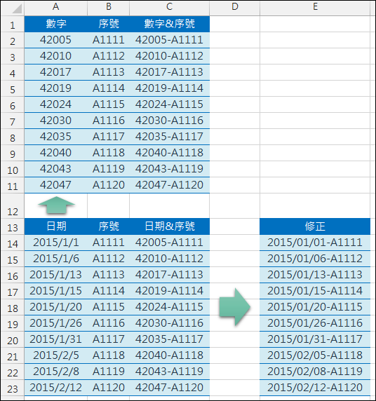 透過 TEXT 函數直接將數字轉換為日期格式,再串接其他字串,所得結果為