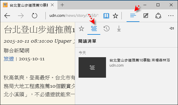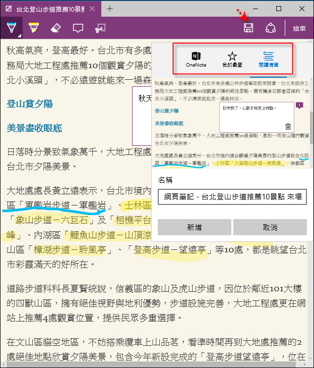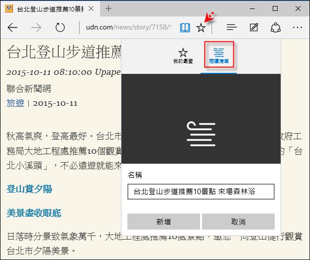 當你整理好了一篇網頁資料,可以按一下「我的最愛」,再點選:閱讀清單。設定該網頁資料的名稱之後,按一下「新增」,即可將此內容搜集起來。