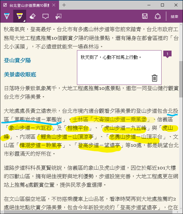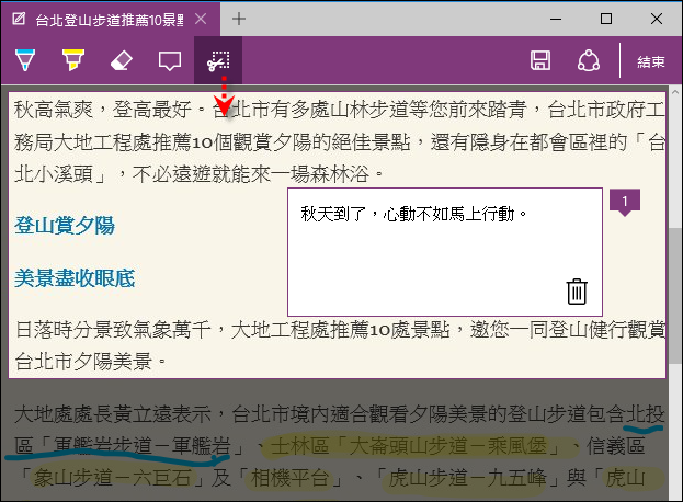 你還可以藉由「建立網路筆記」來對搜集到的資料做註記,在[建立網路筆記]工具列上有手寫筆、螢光筆、橡板擦(用以擦掉筆跡)、輸入筆記、剪裁、儲存及分享等工具。