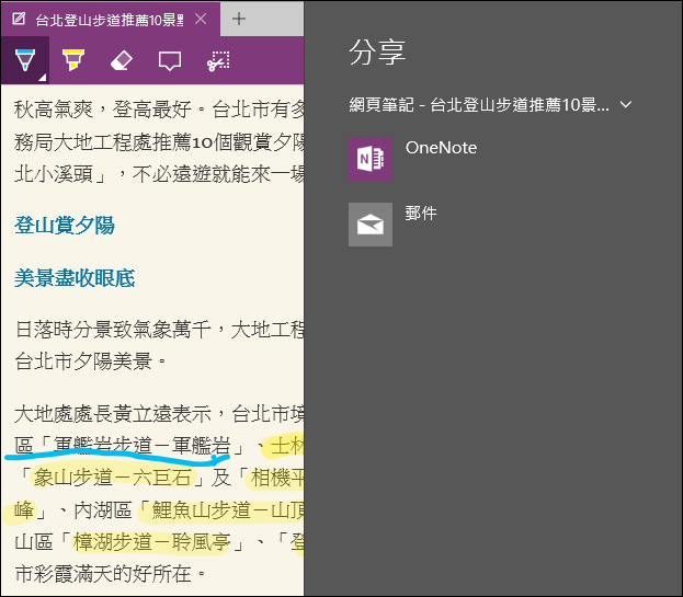 最後,你也可以按下「分享」圖示,將該內容分享至 OneNote 或是藉由郵件來分享。