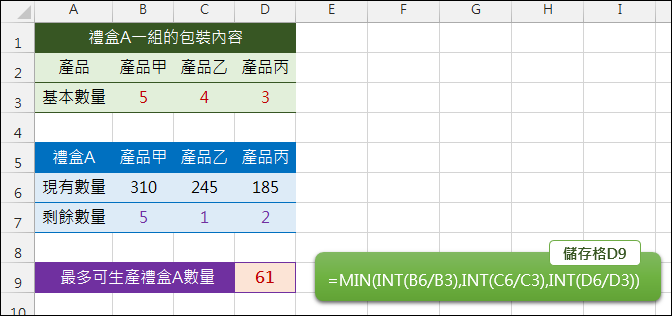 儲存格D9:=MIN(INT(B6/B3),INT(C6/C3),INT(D6/D3))