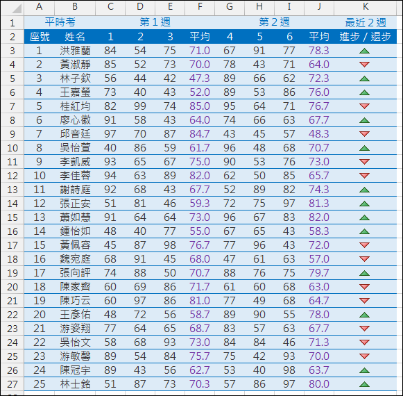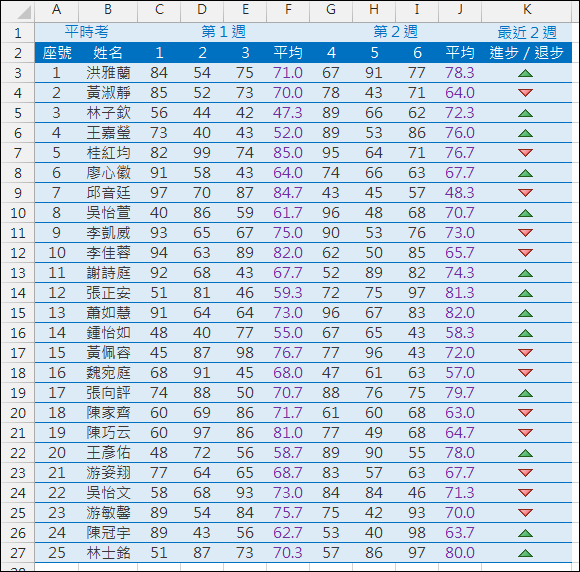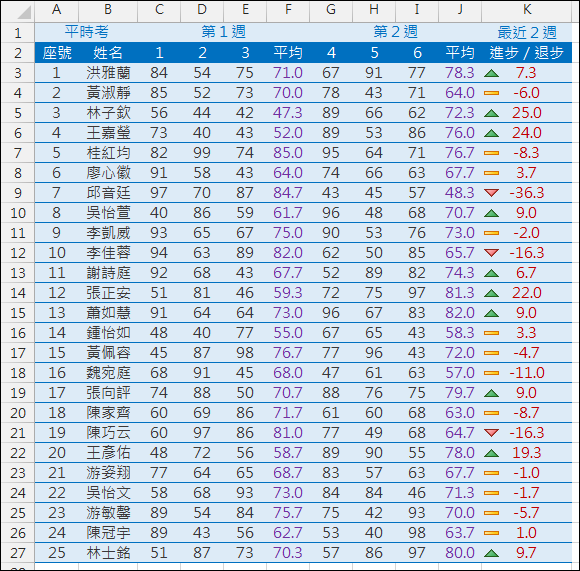 在下圖中,已有兩週的小考平均,如何在第2週比第1週的平均進步時顯示綠色正三角型圖示,在第2週比第1週的平均退步時顯示紅色倒三角型圖示?