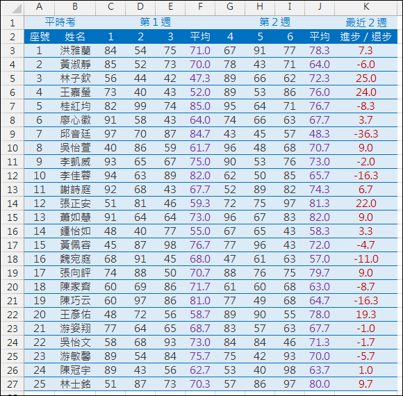 有老師問到:如下圖,在 Excel 中如何製作這個二週小考平均的比較表?