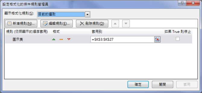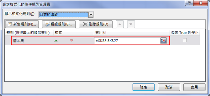 4. 選取[常用/設定格式化的條件]功能表中的[管理規則],顯示[設定格式化的條件規則管理員]對話框。