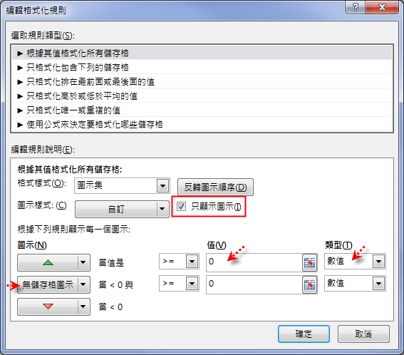 (2) 當 <0 與 >= 0 時(類型:數值),圖示:無儲存格圖示。