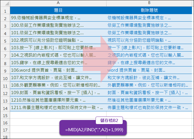 網友問到:在 Excel 中,如果想要將一大堆有題號的題目要刪除題號,該如何處理?