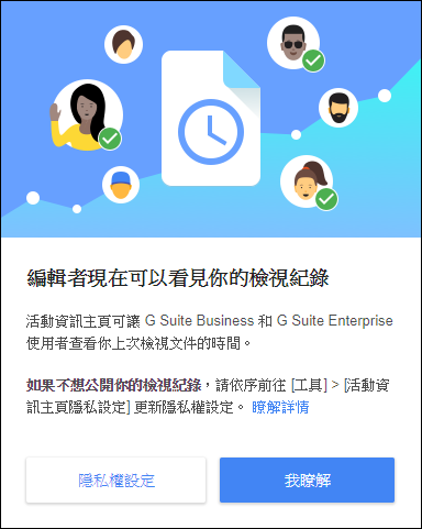 如果你是 G Suite 使用者,現在 Google 可以讓共用對象調整隱私設定,共用對象可以設定不讓他人看到自己的檢視記錄。而且 G Suite 使用者的文件若開放給非 G Suite 使用者,這些使用者也可以設定調整。(目前 Google 的一般帳號並沒有提供該功能)