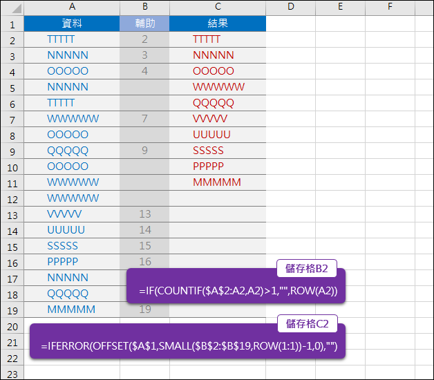 儲存格B2:=IF(COUNTIF($A$2:A2,A2)>1,"",ROW(A2))