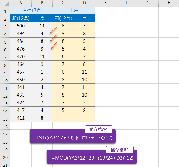 在 Excel 中如下圖的資料表,其中每箱有12盒,每次貨物出庫後,希望能自動計算庫存現在的盒數和箱數。