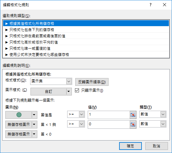 再設定格式化的條件:將「>=1」者以綠燈圖示表示,其餘不顯示圖示。