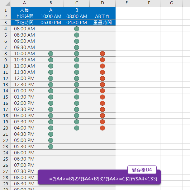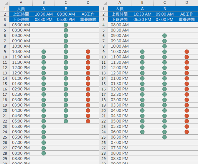 在 Excel 的工作表中記錄了 A 和 B 員工的起迄工作時間,如何依據這個時間繪出二人重疊的時間區域?