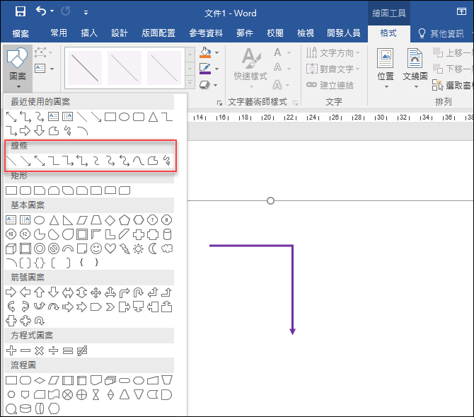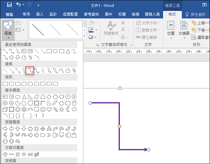 網友問到:如何在 MS Office 中繪製下圖中的90度轉彎的線條?因為在預設的線條圖案中,沒有這一種樣式。
