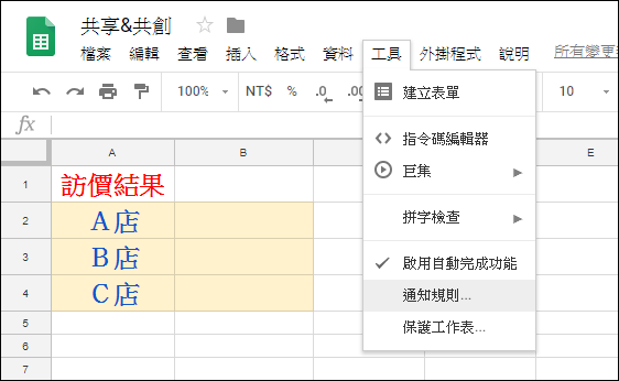 使用雲端工具來共享&共創文件時,應該善用其雲端工作的特性。以下的Google試算表的例子中,有四個人共用了同一個Google試算表,如何讓儲存格內容被填入資料時,通知共享的伙伴?(如下圖左)