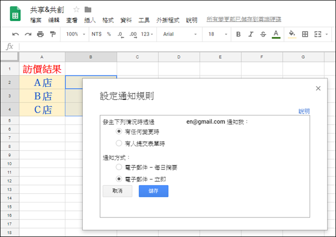 3. 設定通知規則,例如:有任何變動時,立即以電子郵件通知。