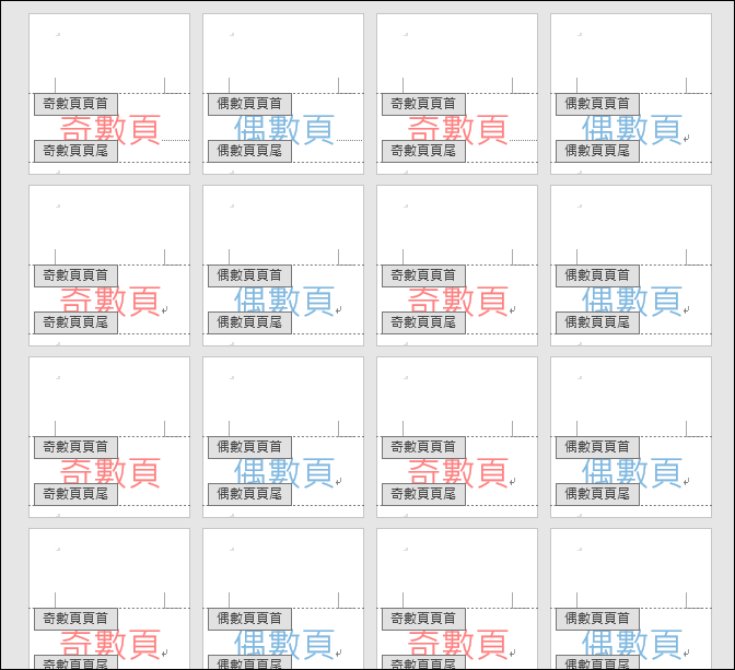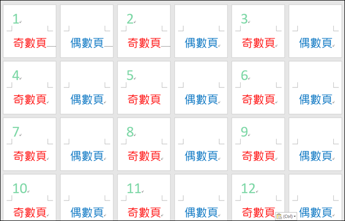 參考下圖,有時在文件中會用到奇數頁或偶數頁固定要顯示某些內容,所以不予編頁碼。因此,要產生每 2 頁接續的連續頁碼。該如何處理?