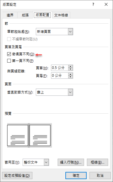 為了只有在奇數頁中顯示頁碼,要先在「版面設定」中設定「奇偶頁不同」。