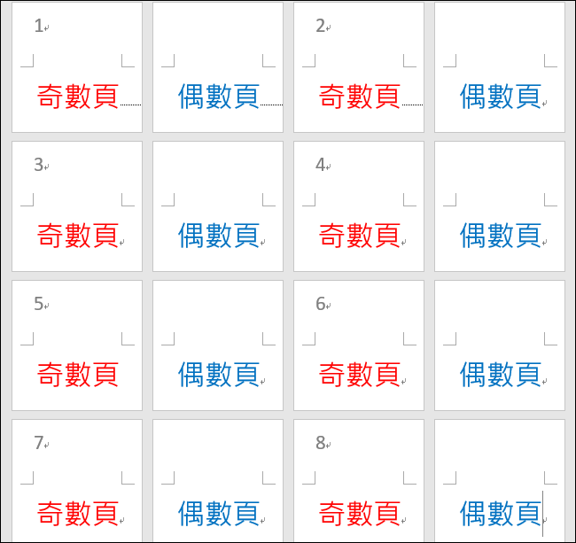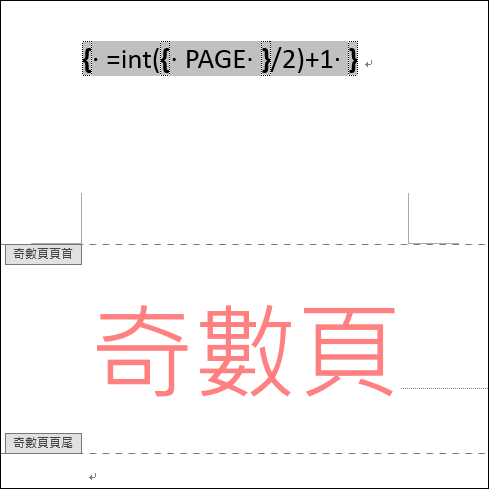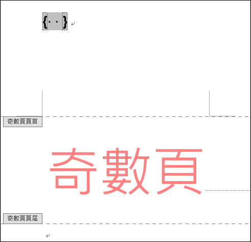 5. 在功能變數上按 F9 鍵。觀察下圖,只有奇數頁有頁碼,並且頁碼是連續數字。