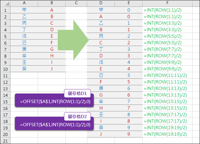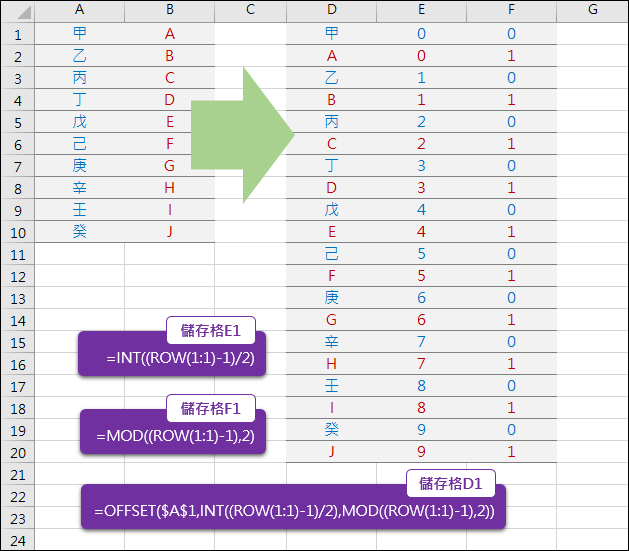 其中「INT((ROW(1:1)-1)/2)」和「MOD((ROW(1:1)-1),2)」分別在E欄和F欄中顯示對應的結果。