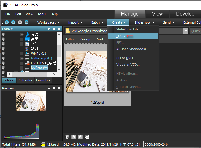 (1) 我慣用的 ACDSee 應用程式,可以預覽 PSD 檔。選取這個檔案後,以其建立一個 PDF 檔案。