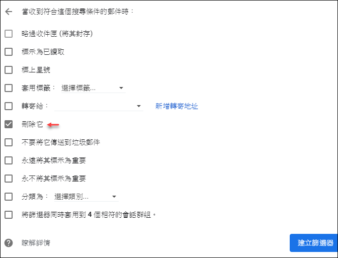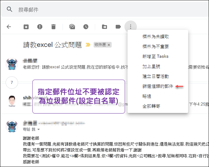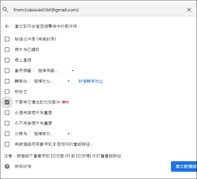 如果把某些郵件位址設定為白名單,Google 就不會將其放入垃圾郵件處理了。