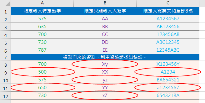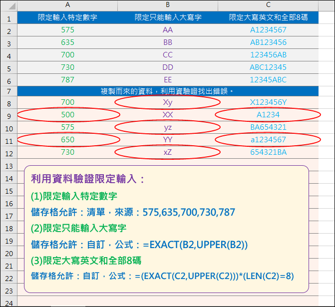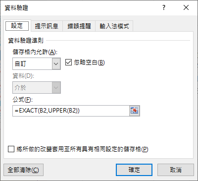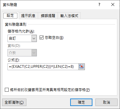 條件一:EXACT(C2,UPPER(C2)),限定輸入大寫英文字。