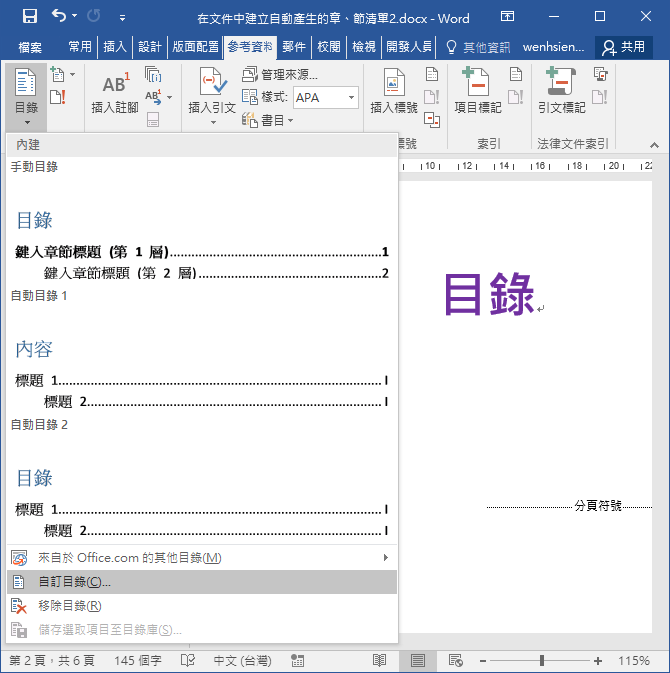 1. 選取「參考資料」功能表中的「目錄/自訂目錄」。