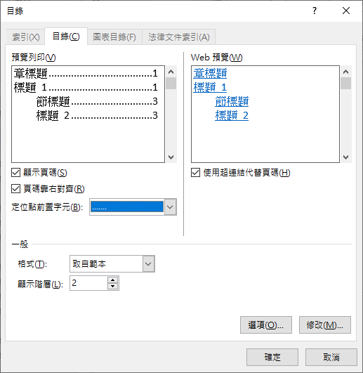 2. 在「目錄」標籤中的「顯示階層」選取「2」(本例僅有章和節二層)