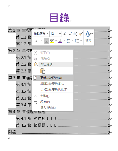 如果章節內容有更動,只需在目錄上按右鍵,選取「更新功能變數」。