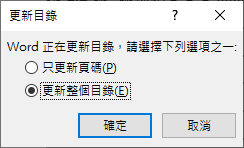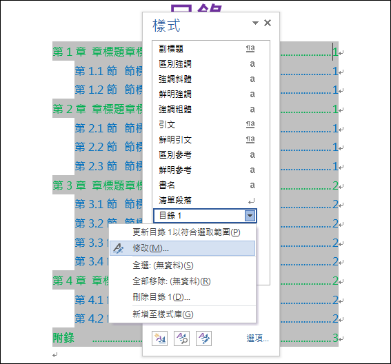 選取「更新目錄1以符合選取範圍」來套用新有的格式,或是選取「修改」,重新設定不同格式。目錄2的做法一樣。