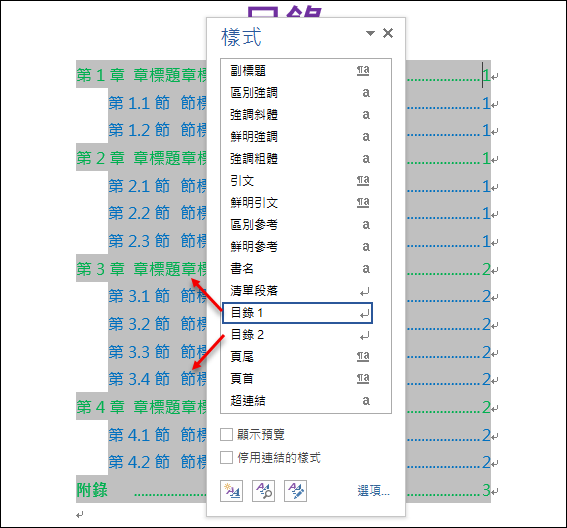 在開啟的「樣式」窗格中,「目錄1」是階層1的格式,「目錄2」是階層2的格式。