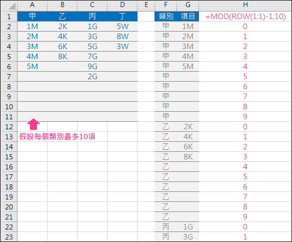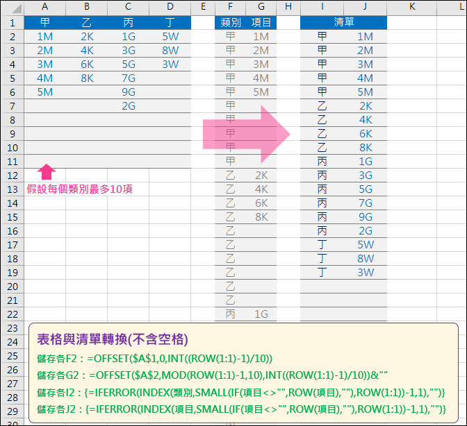 參考下圖,類別:甲、乙、丙、丁,各有不同數量的項目。要以連續方式列出不含空格的項目清單。(本例有使用輔助欄位:類別、項目)