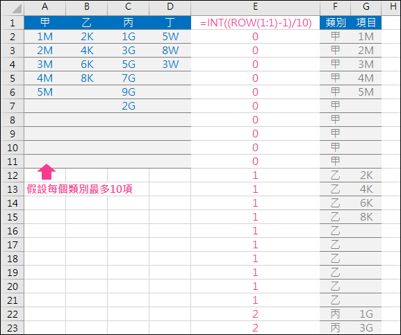 公式向下複製時,INT((ROW(1:1)-1)/10)會傳回:0,0,0,0,0,0,0,0,0,0, 1,1,1,1,1,1,1,1,1,1, 2,2,2,2,2,2,2,2,2,2, 3,3,3,3,3,3,3,3,3,3, …。