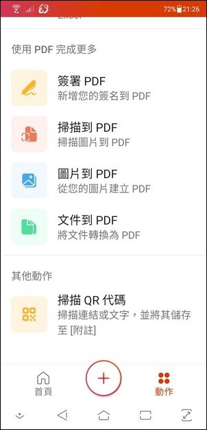 在 Office App 中的「動作」裡,最後一個是「掃描 QR Code 代碼」。
