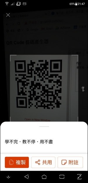 當你對照 QR Code 掃描到一個網址後,立即呈現了這個網址的簡介。