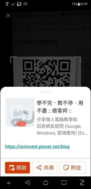 (下圖例子中是掃描到 https://isvincent.pixnet.net/blog)