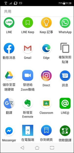 如果選取「共用」則可以挑選要分享至那一個軟體。