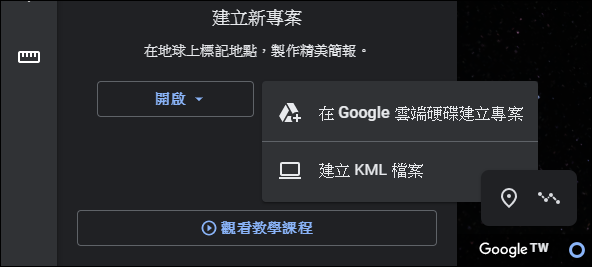 當點選「建立」時,可以選取在 Google 雲端硬碟建立「專案」或是建立 KML 檔案。