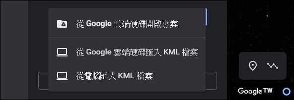 當點選「開啟」時,除了從雲端硬碟開啟專案或匯入 KML 檔案,也能從電腦中開啟 KML 檔案。