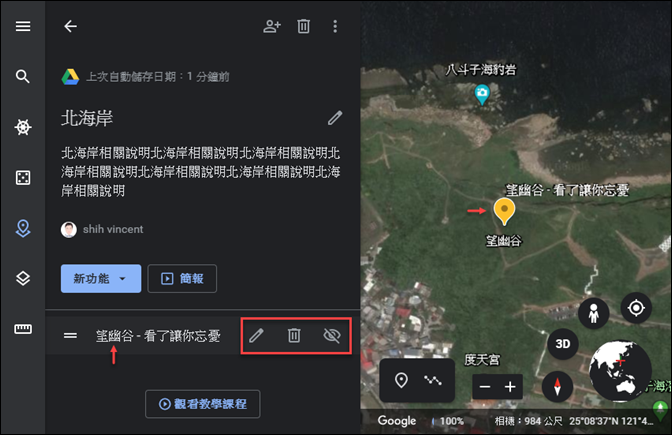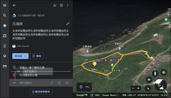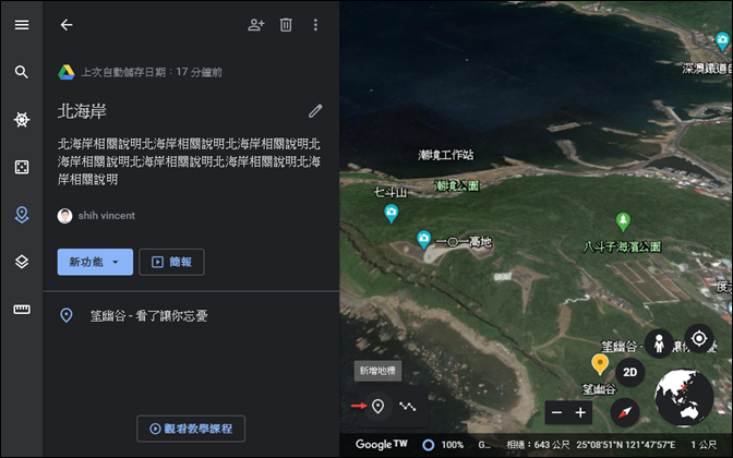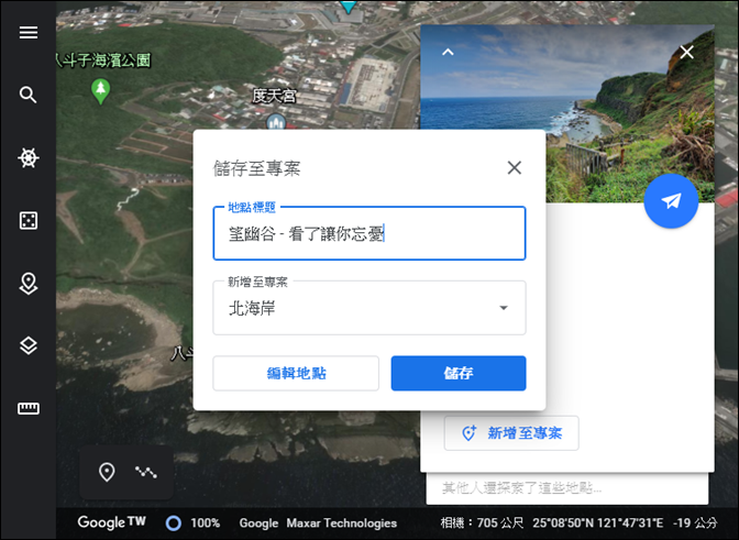 在潮境公園附近點選一個位置,輸入標題(本例:可以聽浪的公園),按下「儲存」。