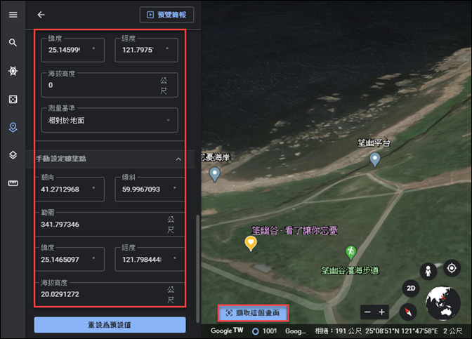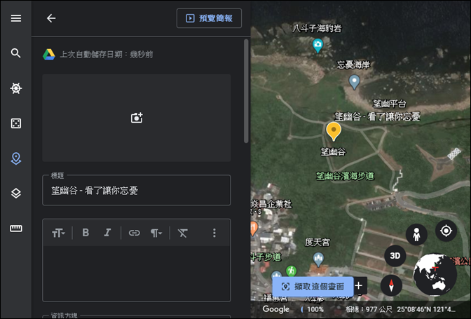調整好地圖,點選「擷取這個畫面」,即可自動填入相關地點資訊。