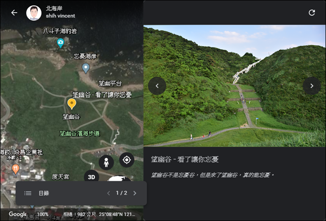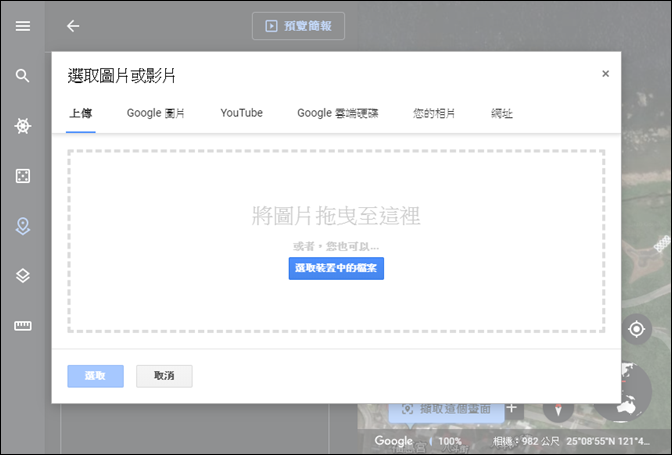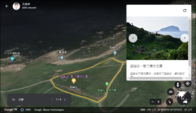 例如:你可以選取一張相片或是YouTube影片,然後標示相片拍攝的位置或是瞭望點。