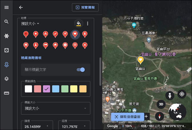 可以修改地標的圖示、色彩、是否顯示標籤文字及標籤文字的大小或色彩等。