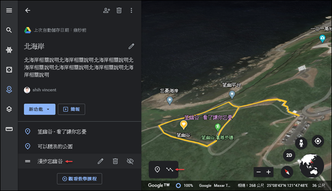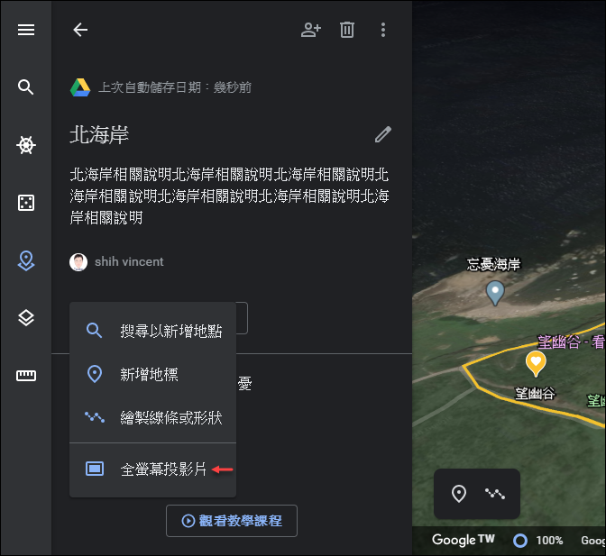 如果你想在地點上標示路徑或某些位置的形狀,可以使用「繪製線條或形狀」。並且新增為簡報的一部分。